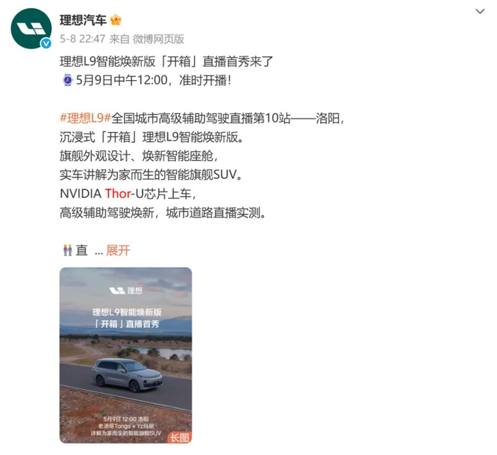 今年 5 月份,理想汽车 L 系列智能焕新版、新款 MEGA 开启交付,理想也成为了首家量产大规模交付 Thor-U 芯片的车企。