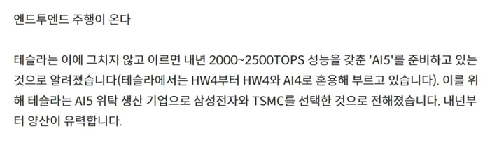 比如就在这篇稿子写完的今天上午,特斯拉下一代自动驾驶硬件 AI5 的信息首次得到具体曝光,传闻称可能将同时基于台积电 N3P 和三星 3GAA 工艺双供应商制造,算力可能将达到 2000-2500TOPS。