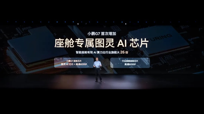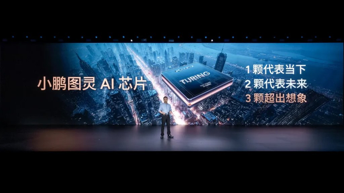 今年 6 月 11 日,小鹏 G7 发布会,何小鹏用这样一张 PPT 宣告自研芯片的强大:超过 2200TOPS 系统总稀疏算力,由三颗图灵芯片共同提供,平均每颗在 750TOPS 上下。