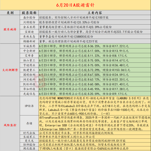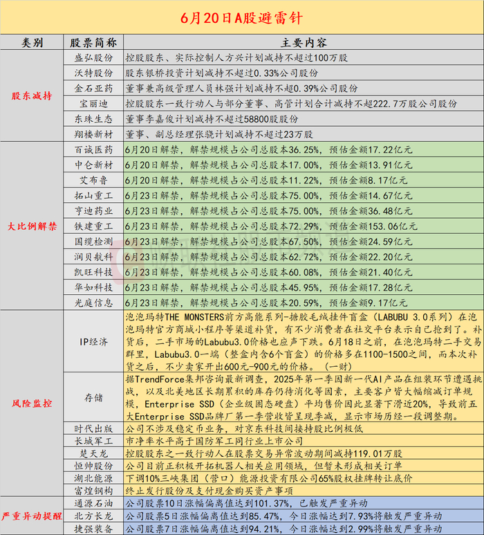 导读:财联社6月20日投资避雷针,近日,A股及海外市场潜在风险事件如下。国内经济信息方面包括:1)Labubu大量补货后二手报价腰斩;2)中原地产表示,5月大湾区新房经理指数跌多涨少,经理人信心回落;公司方面重点关注包括:1)2连板时代出版公告,公司不涉及稳定币业务,对京东科技间接持股比例极低;2)2连板长城军工提示,市净率水平高于国防军工同行业上市公司;海外市场重点关注包括:1)特朗普将在两周内决定是否攻击伊朗;2)国际原子能机构确认伊朗洪达卜重水反应堆遭袭。