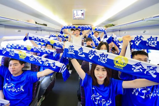 程然是这趟列车的乘客。一个半小时的旅途中,耳边的歌声与欢呼声从未停止。有球迷把代表南京队的蓝色旗帜举过头顶,满车厢的人都唱起助威的战歌。