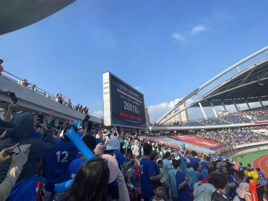 6月14日,苏超联赛第四轮淮安主场迎战南京的下半场,南京球迷程然(化名)回头看了眼大屏幕,显示当前淮安市体育中心的上座人数固定在26018。