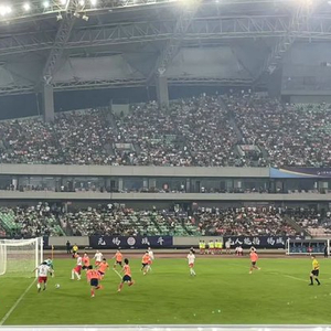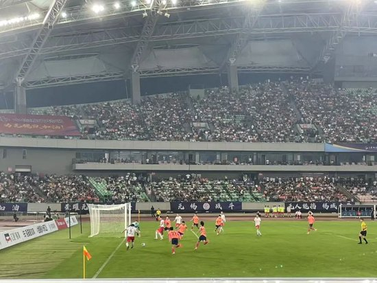 比赛开球不久,体育场就被淮安队的球衣染成红色,像是烈焰在燃烧。鼓声、加油声、喇叭声混在一起,每当主队带球进攻,场内的加油声就会山呼海啸般袭来。