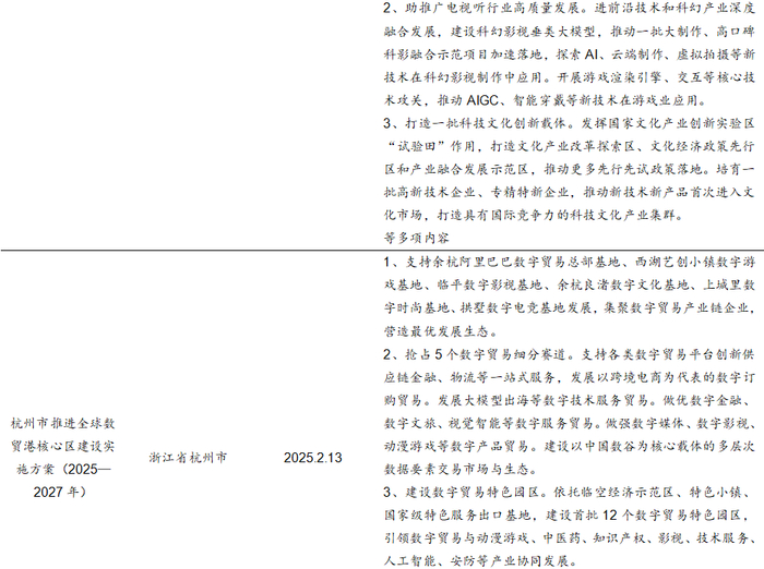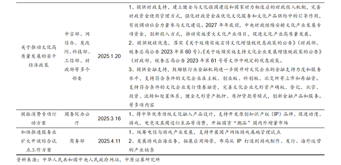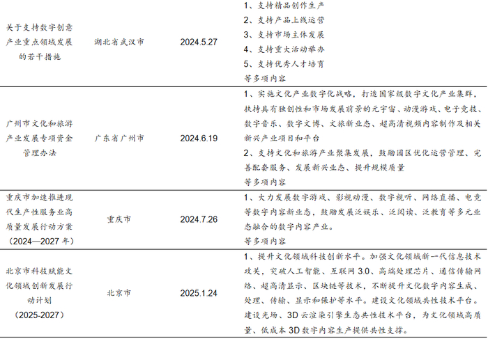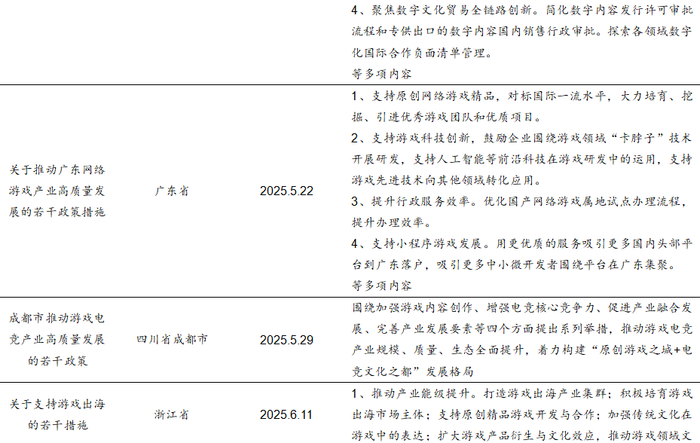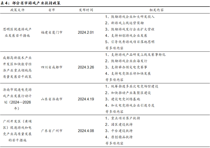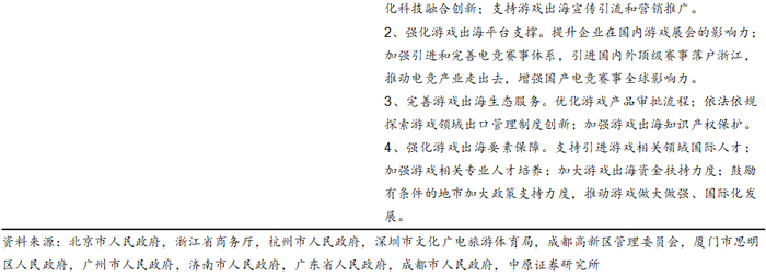 我们认为,从政策落脚点来看,地方政策通常更加明确、具体地突出对游戏产业的重视和扶持,提供包括财政专项资金支持、税收减免、园区建设、简化行政审批流程等在内的政策组合拳,政策更具有针对性和灵活性。而国家层面的政策更聚焦于文化产业全面发展,虽然较少直接提及游戏领域,但作为文化产业与数字经济产业的核心组成部分之一,国家政策对于文化产业、数字经济的扶持和鼓励也会明显促进游戏产业的发展。