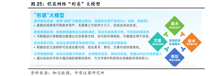 举例来说,恺英网络结合游戏研发的工作流和实际的游戏开发需求自研的“形意”大模型已经落地应用于游戏研发场景,能够覆盖动画生成、地图场景生成、数值设计、代码生成、界面设计等环节并根据开发者实际研发经验进行调整,借助AI的强大能力优化游戏研发流程,减少开发过程中的重复劳动和沟通成本,提升游戏研发的效率。