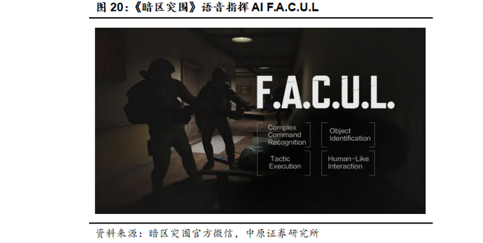 举例来说,腾讯《暗区突围:无限》的语音指挥AI队友F.A.C.U.L允许NPC角色识别包括建筑物、武器、载具等在内的上万个游戏物品,从而根据玩家的语音指令精准执行例如掩护、包抄等战术行为,与玩家达成复杂的战术协作,同时还能够进行实时环境天气的感知与辨认、基于与玩家的互动做出闲聊反应,增强游戏玩家的游戏协作体验。