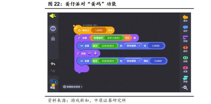 例如网易《蛋仔派对》推出的“蛋码”以及“万能生成器”功能,“蛋码”功能能够自由制定玩法,创作者不需要掌握专业的代码知识,只需要通过图形化、简单易懂的编程逻辑,将事件、条件和动作的语句进行拼接就能够实现复杂的逻辑和玩法。“万能生成器”通过AIGC功能将用户输入的文字内容自动生成为游戏中相对应的物体并能够进行细节的补充和调整,帮助玩家完成游戏内物体组件的创作与搭建。