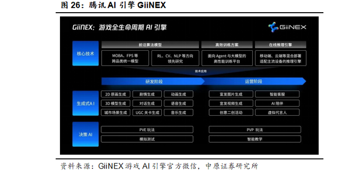 腾讯AI Lab推出了自研游戏全生命周期AI引擎GiiNEX,包含前沿算法模型、高效训练平台以及在线推理引擎三大核心,能够支持游戏从研发到运营的全生命周期。借助大模型等生成式AI技术,在研发和运营阶段提供包括2D原画、3D模型、剧情、对话、关卡、音乐、宣发素材等内容的生成,帮助游戏开发者提升高质量内容的生成效率。根据GiiNEX游戏AI引擎官方微信披露,在GiiNEX引擎的帮助下,构思并创建一个面积为25平方千米的城市的开发时间从过去的5天减少至25分钟,效率提升百倍,单栋建筑生成相比传统手工搭建提效50倍。同时GiiNEX还为玩家提供了一系列游戏内可用的UGC关卡设计工具,目前已经在《元梦之星》上线,帮助玩家将创意和想法转化为个性化游戏关卡。