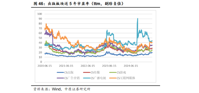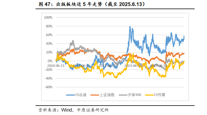 截至2025年6月13日,出版板块整体的PE(TTM,剔除负值)为19.10倍,传媒板块整体的PE为28.06倍,出版板块的PE长期明显低于传媒行业整体,同时相比广电、广告、游戏、互联网媒体等子板块的估值水平也更低。