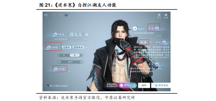 网易《逆水寒》加入了自捏江湖友人玩法,玩家能够创根据自己的喜好定制具有独特外貌、声音的智能NPC并自创性格、经历、职业等带有“灵魂”的拟人化特征,陪伴玩家共同游戏,同时在玩家下线后智能NPC还可以独立探索游戏世界并将见闻记录反馈给玩家。同时逆水寒还上线了DeepSeek驱动的智能NPC“沈秋索”,能够读懂玩家一言一行,与玩家分享江湖经理以及深度情感交流。