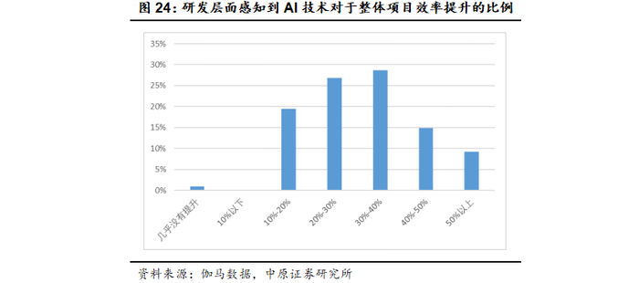 AI技术和AI工具能够辅助多个游戏研发环节的效率提升,并且AI技术的进步还在进一步扩大AI在游戏研发流程中的参与度和渗透率。根据伽马数据的《中国游戏产业新质生产力发展报告》显示,在研发层面的应用表现,有超过99%的受访者表示AI对整体项目效率有所提升,有近80%的从业者感知效率提升超20%,近10%的从业者认为AI能带来50%以上的效率提升。