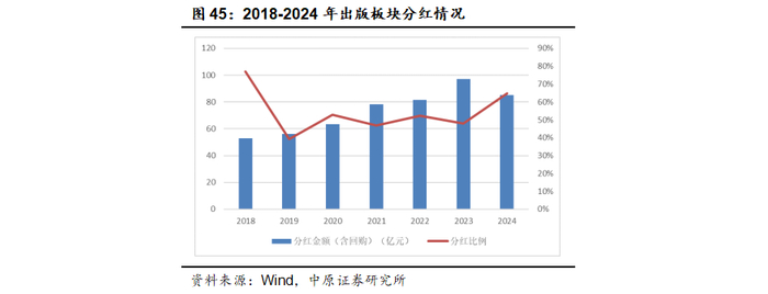 2024年出版板块的年度累计分红总额85.25亿元,同比减少12.20%。以2024年131.35亿元归母净利润计算,分红比例为64.90%,yoy+16.82pct,分红比例达到2019年以来的最高水平。31家公司中有3家公司分红比例在80%以上,8家公司分红比例在60%-80%之间,分红比例高于50%的公司数量占比58.06%。
