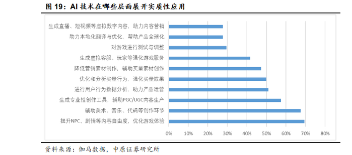 目前的AI技术和工具在游戏产业已经有较高的渗透率。根据伽马数据发布的《中国游戏产业新质生产力发展报告》显示,有超过99%的受访者所在的公司或部门已经通过多种渠道引入AI技术和工具,在TOP50游戏企业中,近半头部游戏企业已利用AI提升生产能力,并构建智能生产管线,或进行虚拟内容生产,帮助用户生成互动内容等。在功能层面,近七成受访者表示AI技术在“提升NPC、剧情等内容自由度,优化游戏体验”以及“辅助美术、音乐、代码等创作环节”展开实质性应用。