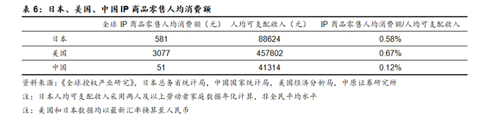 虽然我国IP衍生品市场发展迅速,但人均支出仍有提升空间。根据国际授权业协会发布的《2023年全球授权产业研究》,2022年美国IP商品人均消费额为3077元,日本为581元,而中国仅有51元,占人均可支配收入比分别为0.67%、0.58%、0.12%,中国人均IP商品零售消费额以及占人均可支配收入的比重相比美国和日本明显更低,意味着还有较大的增长空间。