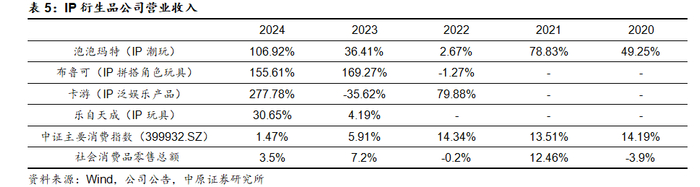 国内IP衍生品消费的旺盛需求也体现在相关公司的业绩层面。对比来看,泡泡玛特、布鲁可、卡游、52TOYS等主营不同类型IP衍生品的头部公司营业收入增速明显高于中证主要消费指数(399932.SZ)的营业收入增速,同时也明显高于国内社会消费品零售总额的增速,展现出了更强的结构性增长。