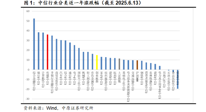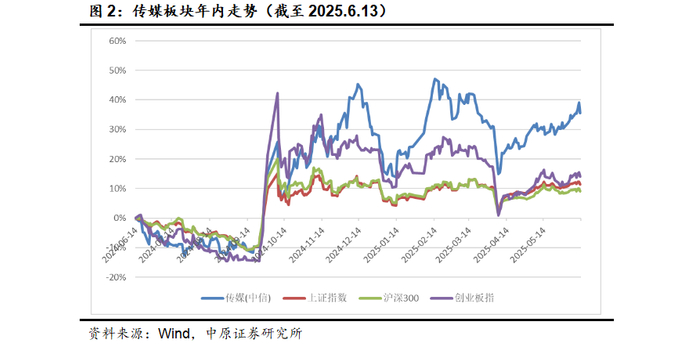 截至2025年6月13日,中信传媒指数近一年上涨36.04%,跑赢沪深300指数(9.59%)26.45pct,跑赢上证指数(11.49%)24.55pct,跑赢创业板指数(14.96%)21.07pct。从涨跌幅排名来看,近一年来传媒板块在31个一级行业中排名第4位,表现优异。
