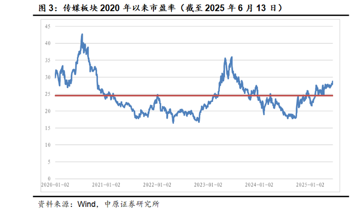 从估值角度来看,截至2025年6月13日,传媒板块的PE(TTM,剔除负值)28.06倍,2020年以来传媒板块的平均PE为24.55倍,中位数为23.34倍,当前估值历史分位数77.80%。