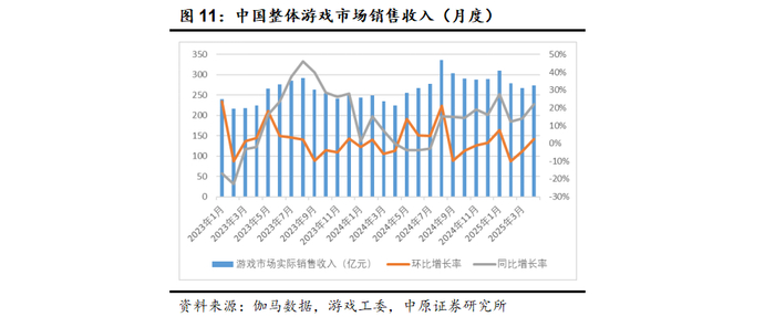 自2024年8月后,国内游戏市场单月规模保持两位数以上的同比增速。截至2025年4月,国内游戏市场规模273.51亿元,同比增长21.93%,1-4月市场规模1130.55亿元,同比增长18.92%。考虑游戏市场环比波动幅度通常比较小,预计1-4月的高增速将延续至2025年全年。