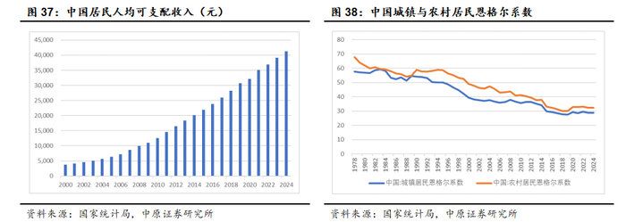 根据国家统计局数据,全国居民人均可支配收入从2000年的3721元增长至2024年的41314元,25年间增长超10倍。消费水平以及消费支出结构随着收入的增长发生较大变化,消费能力不断提升,消费结构更加多元。根据我国城镇与居民恩格尔系数来看,分别从2000年的39.40%和49.10%下降至2024年的28.80%和32.30%,在基础的物质生活得到较好的满足后,国内居民开始提高对精神层面的消费需求,在实用性、功能性之外更加注重产品的文化内涵、情感价值和精神共鸣。