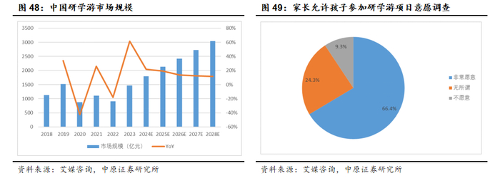 据艾媒咨询数据显示,2023年中国研学游行业市场规模达到1469亿元,预计到2028年研学游行业规模将突破3000亿元,期间复合增长率约15.66%。根据受访者调查,有66.4%的受访者表示非常愿意自己孩子参加研学游,仅有9.3%明确表示不愿意,研学赛道的市场空间广阔。