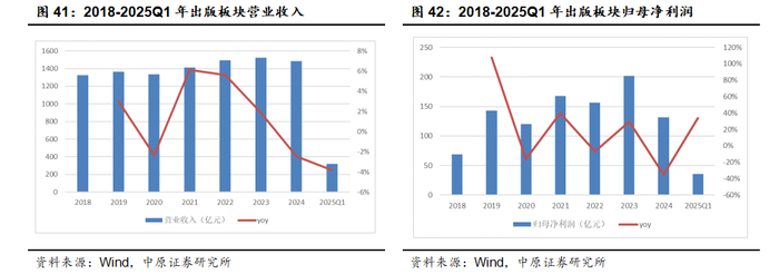 政策的变动导致国有图书出版企业需要进行递延所得税资产/负债的重新调整,对2023年确认的递延所得税费用进行会计冲回,导致2023年和2024年出版板块整体的所得税费用存在一次性的大幅波动。对比之下,2023年出版板块整体的所得税为-24.24亿元,2024年为34.98亿元,2025Q1为0.96亿元,差异巨大。如果扣除所得税因素,2024年出版板块的税前利润总额为170.26亿元,yoy-5.95%,降幅明显收窄,2025Q1税前利润总额为37.37亿元,同比基本持平。