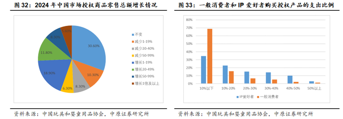 相比于没有IP的产品,通过IP的加持不仅带动了产品销量提升,还赋予了产品更多的附加值和溢价空间。根据中国玩具和婴童用品协会发布的《2025中国授权行业发展白皮书》显示,2024年有44.6%的受访授权商实现授权产品零售额增长,其中25.7%实现了20%以上的增长,5.6%实现了100%以上的增长;有50.4%购买授权商品的消费者为IP爱好者,其中因为喜欢IP购买占比25.9%;相比一般消费者,IP消费者可支配收入中用于购买授权产品的比例也明显更高,付费意愿明显更强。因此在整个产业链中,基于消费者对IP的情感因素与忠诚度,IP是整个产业链的核心与价值源头,具有较高的壁垒和不可替代性,属于垄断资源,高知名度的头部IP的往往拥有比较强的议价能力。