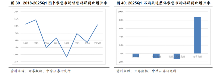 从渠道来看,实体店、平台电商以及垂直及其他电商依然负增长,尤其是码洋规模最大的平台电商和2023年相比降幅更大,内容电商虽然继续保持正增长,但增速明显放缓。2025Q1随着中国消费市场的复苏,国内零售市场码洋同比上升10.77%,内容电商渠道同比增长86.95%。