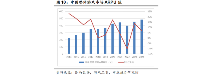 根据伽马数据和游戏工委联合发布的《中国游戏产业报告》数据,2024年国内游戏市场规模约3257.83亿元,同比增长7.53%,用户规模约6.74亿,同比增长0.90%,用户ARPU值约485.52元,同比增长6.73%。市场规模、用户数量、ARPU值数据均创历史新高,国内游戏行业基本面稳固,能够维持比较高的景气度,玩家的游戏意愿和消费意愿都有不同程度的提升并带动市场规模的增长。