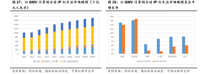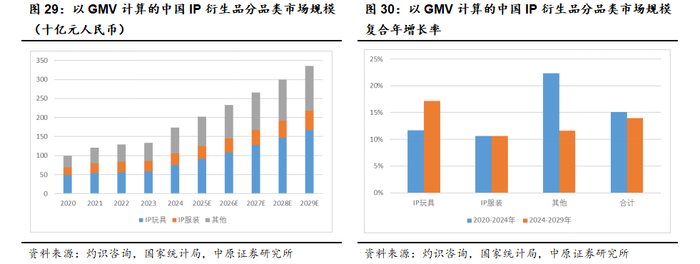 从增长速度来看,IP玩具在2020-2024年的复合增长率为11.7%,2024-2029年将提升至17.2%,其他IP衍生品2020-2024年复合增长率22.3%,2024-2029年复合增长率为11.6%,都能够保持比较高的增长速度。相比于IP玩具和其他IP衍生品,IP服装的市场规模较小,增速也略低。