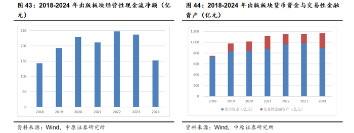 我们选取货币资金以及交易性金融资产等易变现资产作为衡量资金储备的指标。截至2024年末,出版板块整体共有890.74亿元货币资金以及284.80亿元交易性金融资产,整体的账面资金储备充沛,与板块的整体净资产比重约为57.41%,而同期传媒板块整体该数据为44.90%。其中中文传媒、中南传媒、浙版传媒、皖新传媒的资金储备超百亿,新华文轩超90亿元,山东出版近80亿元,中原传媒超50亿元。