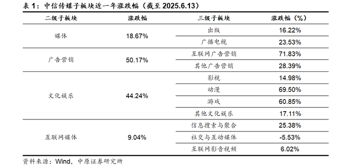 从子板块的表现来看,分化比较明显。互联网广告营销以及动漫板块受AppLovin、谷子经济等主题行情的影响,近一年涨幅分别达到71.83%和69.50%,游戏板块基本面与政策面共振,近一年涨幅为60.85%,广电板块、其他广告营销板块涨幅20%以上,影视板块上涨14.98%,出版板块上涨16.22%,互联网媒体板块上涨9.04%。