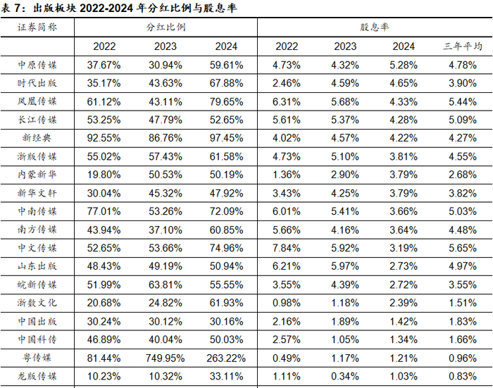 以2024年末为基准,中原传媒股息率超5%,时代出版、凤凰传媒、长江传媒、新经典股息率超4%,浙版传媒、内蒙新华、新华文轩、中南传媒、南方传媒、中文传媒股息率超3%。以2022-2024年三年平均股息率为标准,中文传媒、凤凰传媒、长江传媒、中南传媒的股息率超5%,山东出版、中原传媒、浙版传媒、南方传媒、新经典股息率超4%。