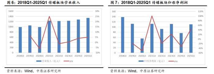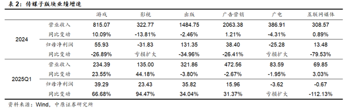 2025Q1游戏板块以及影视板块的营收和利润增长优异,主要是靠优质内容产品的拉动,出版板块业绩的增长来自于所得税优惠政策的延续。广电、互联网媒体两个板块则面临较大的业绩下行压力。