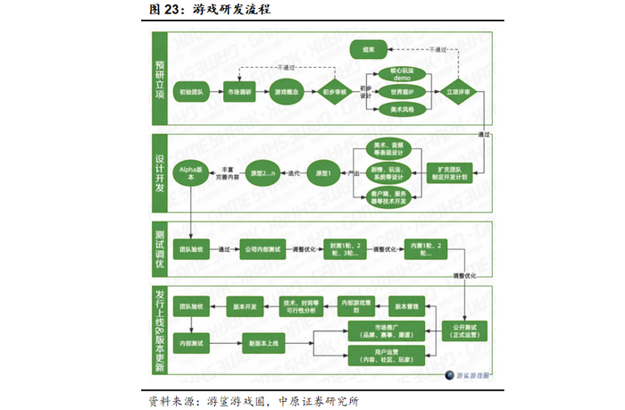 游戏产品从最初的立项概念到最终的上线运营需要经历较为复杂的生产过程,其中包含了大量的文本、代码、图片、动画、视频、音频等内容要素,涉及策划、技术研发、美术表现、发行运营、项目管理等多个岗位。从流程来看,主要可以分为预研立项、设计开发、测试调优以及最终的发行上线和版本更新四个大环节,每个环节又涉及到多个流程节点。