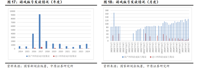 根据国家新闻出版署,国内游戏版号发放数量相比2024年以前明显扩容。2024年全年发放国产游戏版号12批次共1306款,同比增加33.67%,进口游戏版号共发放7批次111款,同比增加13.27%,进口版号的发放频次增加较为显著。