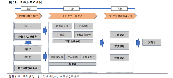 从IP衍生品的产业链结构来看,上游负责IP的创作与授权,市场参与者主要有IP持有人以及第三方IP授权公司。中游负责IP衍生品的开发和生产,主要参与者有IP衍生品公司和制造商,IP衍生品公司在完成IP衍生品的研发与设计后采用自有生产或第三方代工等方式完成IP衍生品的生产环节。下游负责IP衍生品的销售,包括直营渠道、分销渠道以及委托销售等模式。