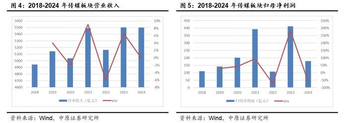 综合来看,传媒板块2024年的营收表现比较稳定,但利润下滑幅度明显,差异部分主要是:(1)国有文化企业税收政策变化导致传媒板块整体的所得税费用在2023年和2024年出现较大差异,2023年和2024年板块整体的所得税分别为8.20亿元和78.07亿元,但该部分主要是一次性影响,预计2025年将恢复正常;(2)公允价值变动净收益存在差异,2023年和2024年分别为27.93亿元和-20.08亿元;(3)ST明诚在2023年存在72.69亿元其他收益,主要来自于债务重组收益,导致利润端存在基数效应。