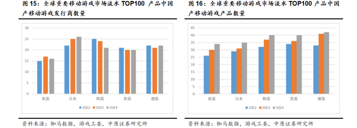 中国游戏企业在出海的过程中积累了丰富的研发和运营经验,对当地市场理解更加深入,能够持续推出符合当地用户需求与特征的产品。在美国、日本、韩国、英国、德国五个重要游戏市场中,移动游戏领域流水TOP100的游戏产品中来自中国的发行商数量占比在15%-25%左右,发行商数量虽有波动,但整体稳定;同时在这五个国家移动游戏流水TOP100的产品中,来自中国的游戏数量占比在35%-40%左右,并且相比往年均有不同程度的增加。