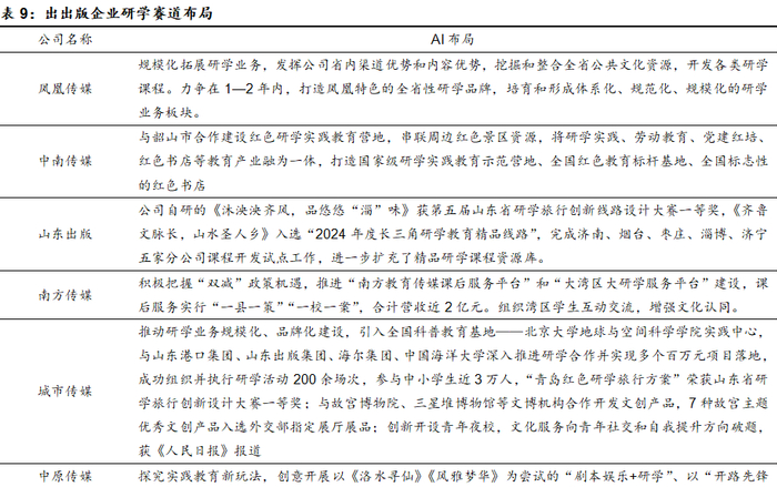 部分国有图书出版企业结合自身图书版权、当地公共文化资源以及线下书店等资源与渠道在研学领域进行布局,提供包括爱国爱党教育、素质教育、课外实践等为主题的创意精品研学活动,挖掘教育服务新业态,也为公司挖掘新的增长机会。