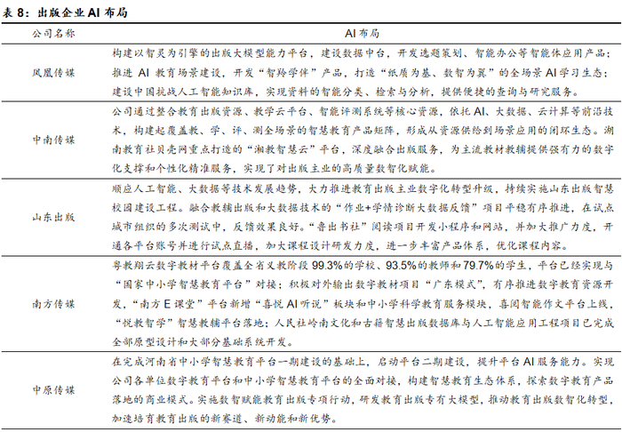 目前来看,国有教育出版企业凭借在教材教辅领域积累的深厚经验,结合当地教育教学资源生态的实际情况,在智慧教育、AI助教、作业批改等方面进行布局;民营出版企业也在利用AI技术打造例如AI校对、AI终端等相关的应用产品。伴随政策的鼓励倡导以及AI技术的进步和应用,预计出版行业还将继续结合自身业务需求,不断加大对于AI相关应用的投入,挖掘AI技术在出版、教育等领域应用的可能性。