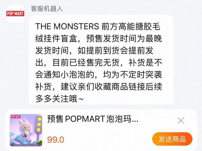 目前,仅天猫泡泡玛特旗舰店渠道,该系列销量已超过70万,链接已下架,客服表示目前已经售完无货,并且补货均为“不定时突袭补货”。