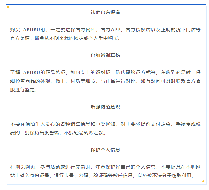 LABUBU的抢购热潮也引起各地消保委的注意。多地消保委发文:警惕黄牛炒作,拒绝高价接盘,关注商品功能性与实用性,避免将潮玩产品异化为“投资品”或“身份符号”。