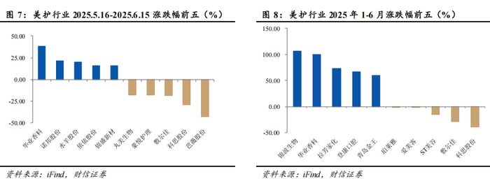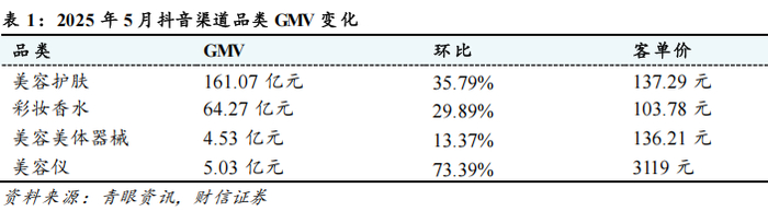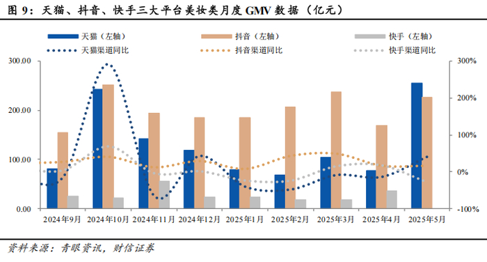 核心观点:展望后市,我们认为,在政策红利持续释放、消费需求不断回暖以及市场信心逐步修复的多重利好因素驱动下,化妆品及医美行业呈现稳中向好的发展态势。与此同时,国货美妆凭借高性价比和精细化运营在市场竞争中不断占据优势,持续看好美护板块未来成长空间,维持行业“同步大市”评级。化妆品部分:在“520”节日效应和“618”大促活动前置双重驱动下,各美妆电商渠道呈现结构性分化。据青眼资讯统计,2025年5月,天猫、抖音、快手渠道合计口径(护肤/个护+彩妆/香水)月度GMV同比增速分别为+42%、+16.1%、-27.5%,反映出化妆品消费需求在大促期间进一步向头部平台集中。后续随着稳增长政策红利持续释放、618大促活动催化,以及市场信心不断回暖的共同作用下,化妆品行业有望迎来继续修复。建议重点关注:①具备强运营能力,大单品+多品牌矩阵持续发力的国货龙头珀莱雅;②婴童护理赛道细分龙头,新品快速放量的润本股份。医美部分:上游供给侧持续扩容,叠加“618”大促促销力度提升,行业景气度有望持续向好。展望未来,随着促消费政策持续发力、医美创新产品加速迭代,以及“618”大促活动等多重利好因素的共同催化下,医美消费景气度有望持续改善。从长期来看,行业渗透率提升、轻医美化率提升、国产替代率提升逻辑延续,持续看好医美板块未来成长空间。建议关注:国内重组胶原蛋白龙头,业绩或将逐级而上的锦波生物。