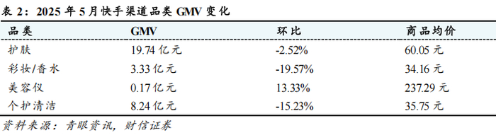 渠道端,受“520”节日催化叠加“618”大促前置效应拉动,淘宝、抖音渠道增速亮眼,快手渠道明显放缓。据青眼资讯统计,2025年5月,天猫、抖音、快手渠道合计口径(护肤/个护+彩妆/香水)月度GMV为255.73亿元、225.34亿元、23.07亿元,同比增速分别为+42%、+16.1%、-27.5%。