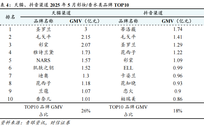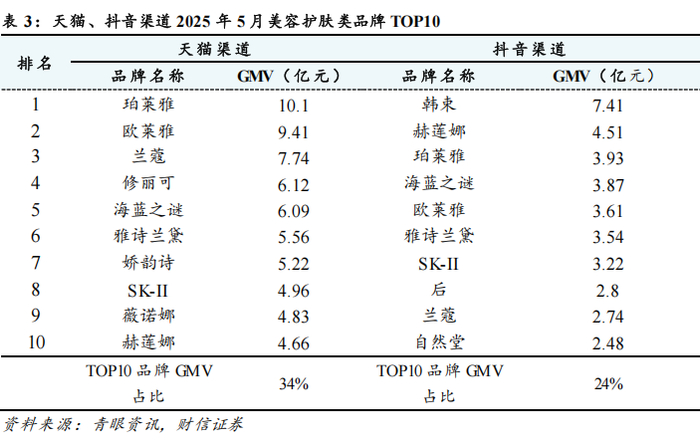 行业数据跟踪:1)渠道端,受“520”节日催化叠加“618”大促前置效应拉动,淘宝、抖音渠道增速亮眼,快手渠道有所放缓。据青眼资讯统计,2025年5月,天猫、抖音、快手渠道合计口径(护肤/个护+彩妆/香水)月度GMV为255.73亿元、225.34亿元、23.07亿元,同比增速分别为+42%、+16.1%、-27.5%。2)品类端,彩妆香水品类增长动能更为强劲。据青眼资讯统计,2025年5月,护肤/个护品类,天猫、抖音、快手月度GMV分别为191亿元、161.07亿元、19.74亿元,同比对应变动+33.6%、+13.5%、-27.5%;彩妆/香水品类,天猫、抖音、快手渠道月度GMV分别为64.73亿元、64.27亿元、3.33亿元,同比对应变动+74.1%、+22.9%、-27%。值得注意的是,彩妆香水品类在天猫、抖音平台均呈现更快的增速,尤其是在天猫平台实现了超70%的同比增长,猜测可能是“520”节日消费场景对彩妆产品的拉动效应影响。3)品牌端,国际品牌线上渠道持续加码,头部品牌市场优势凸显。据青眼资讯统计,2025年5月,护肤/个护品类中,天猫渠道GMV前十依次为珀莱雅、欧莱雅、兰蔻、修丽可、海蓝之谜、雅诗兰黛、娇韵诗、SK-II、薇诺娜和赫莲娜;抖音平台GMV排名前十依次为韩束、赫莲娜、珀莱雅、海蓝之谜、欧莱雅、雅诗兰黛、SK-II、后、兰蔻和自然堂。其中,国际品牌在天猫、抖音渠道中均占据了绝大多数席位,国货品牌势能则稍显不足。彩妆/香水品类,天猫渠道排名前十依次为圣罗兰、毛戈平、彩棠、雅诗兰黛、NARS、肌肤之钥、迪奥、花西子、兰蔻和香奈儿;抖音渠道排名前十为蒂洛薇、毛戈平、圣罗兰、花西子、彩棠、ELL、卡姿兰、花知晓、恋火和柏瑞美。