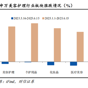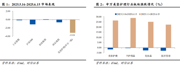 市场行情回顾:上月(2025年5月16日-6月15日,下同),申万美容护理指数下跌3.16%,在申万一级31个子行业中排名第29位,分别跑输上证、沪深300、创业板指数3.05pct、2.06pct、3.19pct。其中,美容护理二级子板块中的个护用品、化妆品和医疗美容的月度涨幅分别为-0.01%、-2.62%和-2.77%。