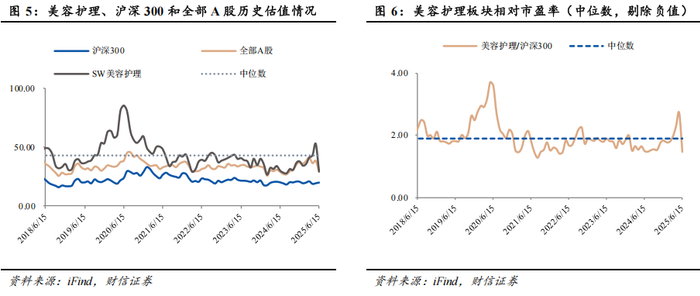 截至2025年6月15日,申万美容护理板块市盈率(TTM,整体法,剔除负值,下同)为29.36倍,位于2016年以来的历史后3.64%分位。沪深300市盈率为19.98倍,其中,申万美容护理相较沪深300溢价0.47倍。
