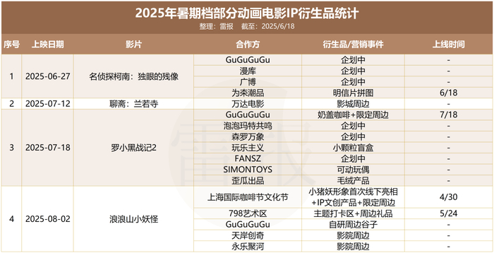 值得一提的是,《哪吒2》衍生品大卖的案例在前,头部动画IP的电影衍生品开发也逐渐趋于前置化(人工统计存在误差):