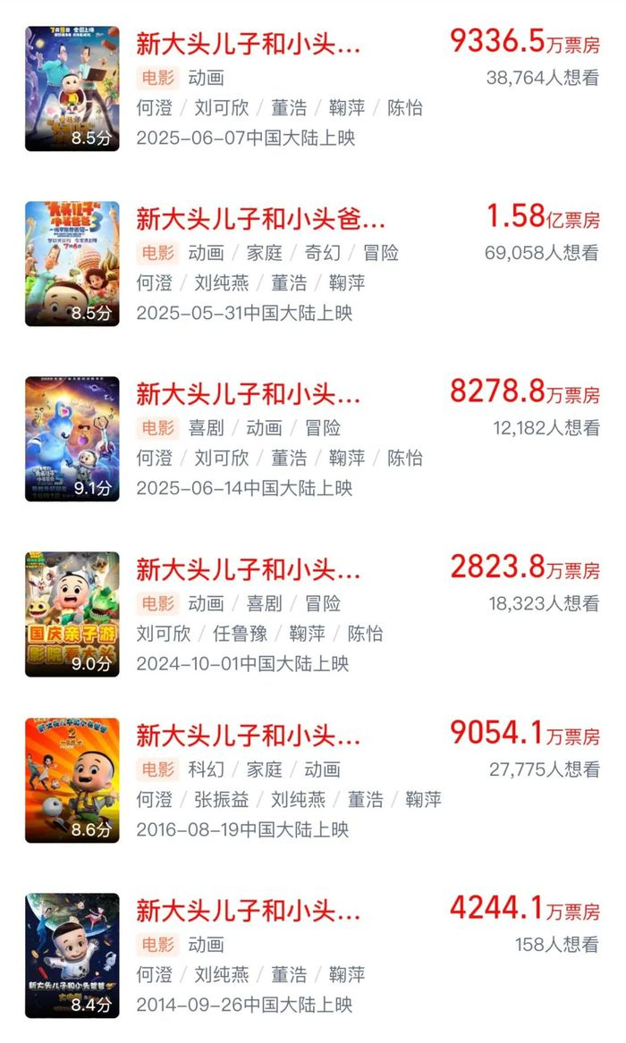 这个暑期档,央视动漫以《新大头儿子和小头爸爸4完美爸爸》《新大头儿子和小头爸爸5:我的外星朋友》2部重映作品率先入场,累计票房突破1.76亿元。目前,《新大头儿子和小头爸爸》共6部动画电影累计票房超4.95亿元,这一成绩不仅验证了低幼向国民IP的持久生命力,更揭示了国营厂的战略转型——通过系列化运作构建“动画宇宙”,将电视台积累的受众基础转化为院线基本盘。