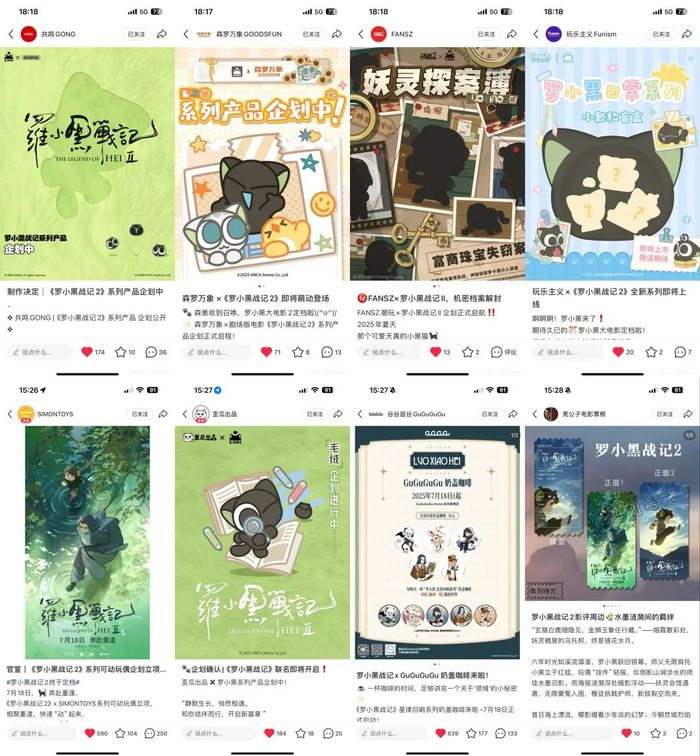 罗小黑IP持续耕耘周边衍生品业务,截至发稿日,《罗小黑战记2》已官宣了至少8个周边企划,合作方包括泡泡玛特共鸣、GuGuGuGu、森罗万象、玩乐主义、FANASZ、SIMONTOYS、歪瓜出品等,涉及主题餐饮、潮玩、盲盒、可动玩偶、毛绒、轻周边谷子等各种IP衍生品类,几乎覆盖Z世代所有主流二次元消费层级。